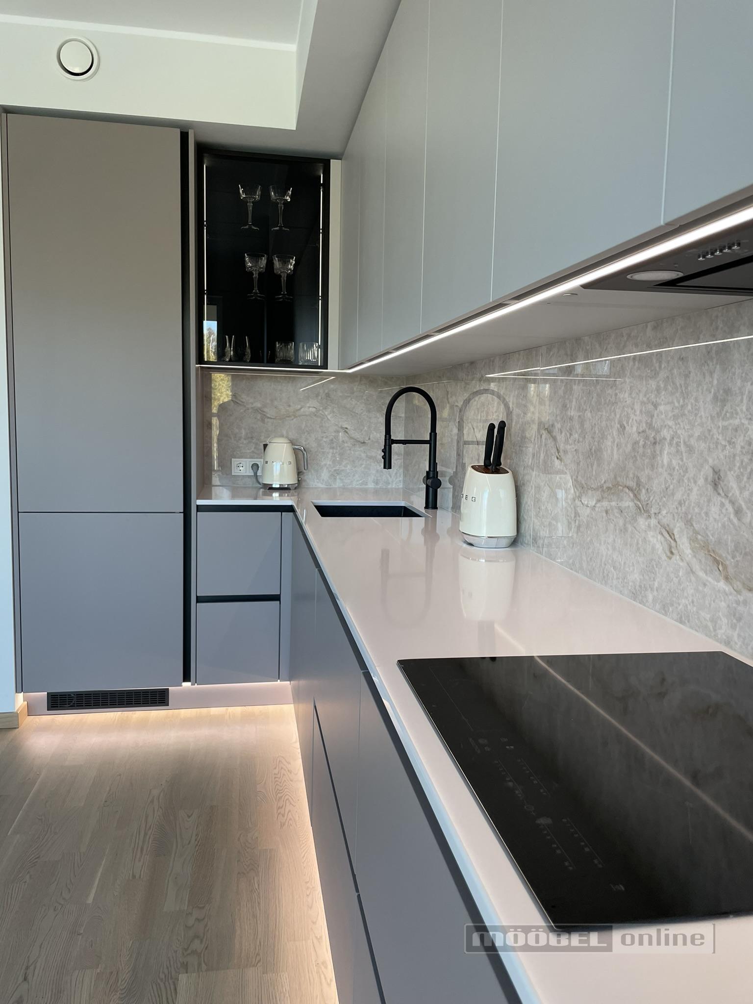 Кarkas : hall niiskuskindel LDSP 16мм Tööpind : Kivi Seinapaneel : Kivi Ül. Uksed : MDF , värv , мат + Egger lam Al. Uksed : MDF , värv , мат
